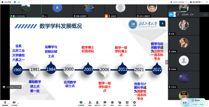 学科宣讲核心环节由各学科主要负责人组织,学科骨干教师系统介绍了学科下设各研究方向基本情况,深入剖析学科前沿与发展机遇,并对研究生在读期间课程设置、可参与的学科竞赛做了详细介绍。在互动环节,各学科教师与在线员工就广受关注的研究方向、课程设置、升学、就业前景等具体问题展开讨论,并耐心地解答了同学们的问题。