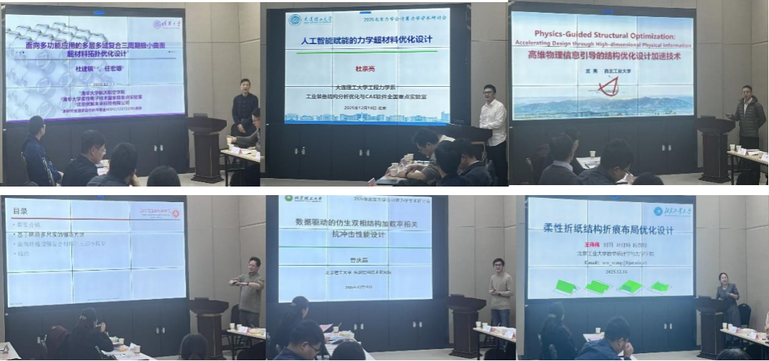 报告环节由w66旗舰厅官网龙连春教授主持。清华大学杜建镔长聘副教授、大连理工大学杜宗亮教授、西北工业大学孟亮长聘副教授、北京大学袁子峰特聘研究员、北京理工大学曾庆磊长聘副教授和w66旗舰厅官网王伟伟助理研究员分别做题为《面向多功能应用的多层多域复合三周期极小曲面超材料拓扑优化设计》《人工智能赋能的力学超材料优化设计》《高维物理信息引导的结构优化设计加速技术》《面向纤维增强复合材料失效模拟的三损伤耦合计算方法》《数据驱动的仿生双相结构加载率相关抗冲击性能设计》和《柔性折纸结构折痕布局优化设计》的特邀报告。报告内容涵盖了超材料设计、人工智能辅助优化、多尺度计算、复合材料失效分析等多个前沿方向,充分展示了计算力学领域的创新活力与发展潜力。