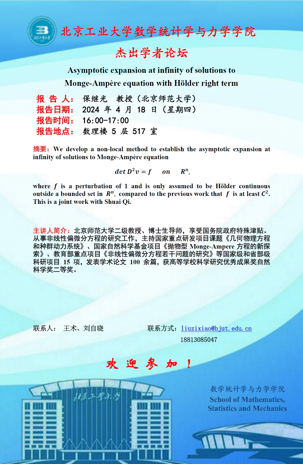 【数统力|学术报告】——Asymptotic expansion at infinity of solutions to Monge-Ampere equation with Holder right term