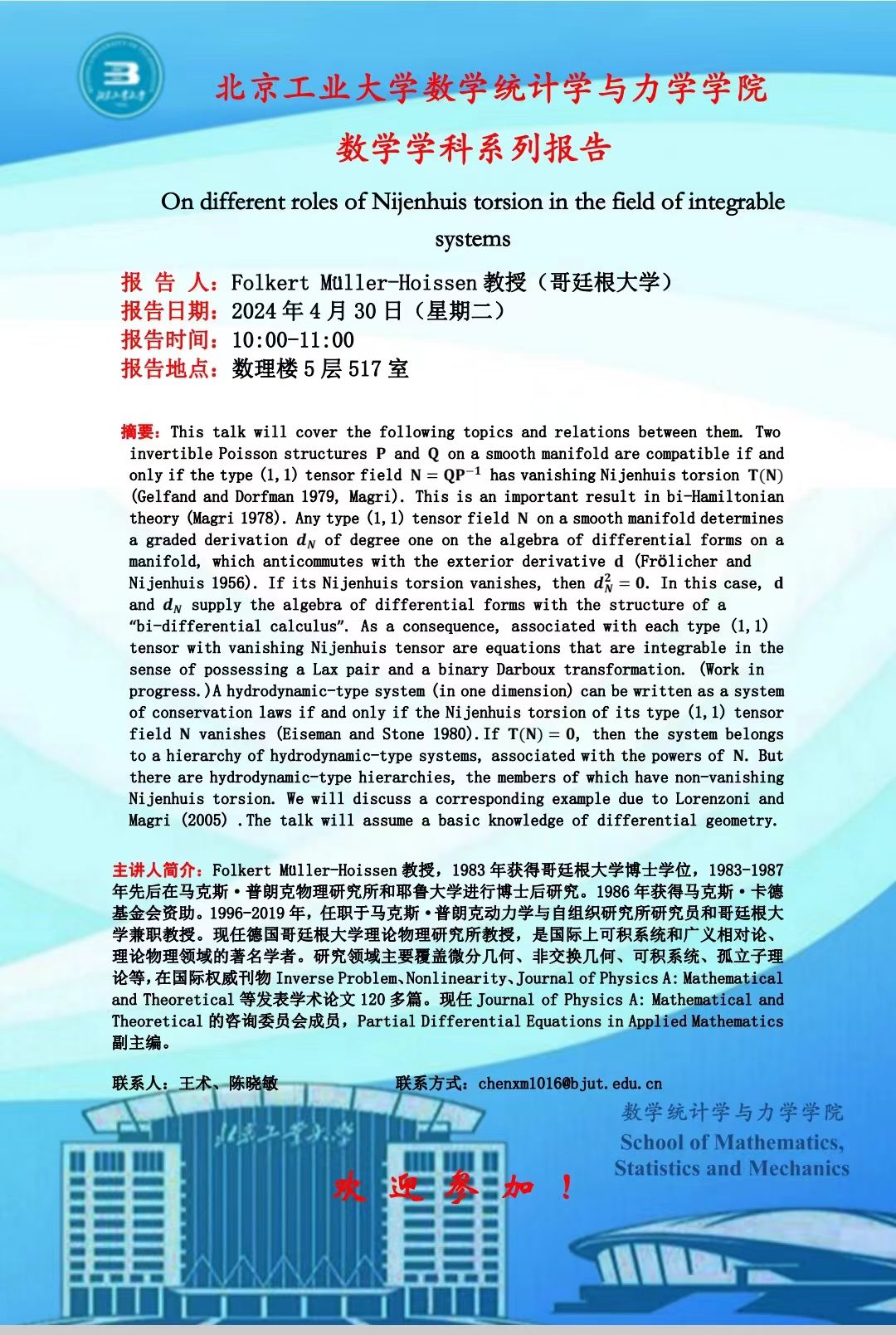 【数统力|学术报告】——On different roles of Nijenhuis torsion in the fields of intergrable systems