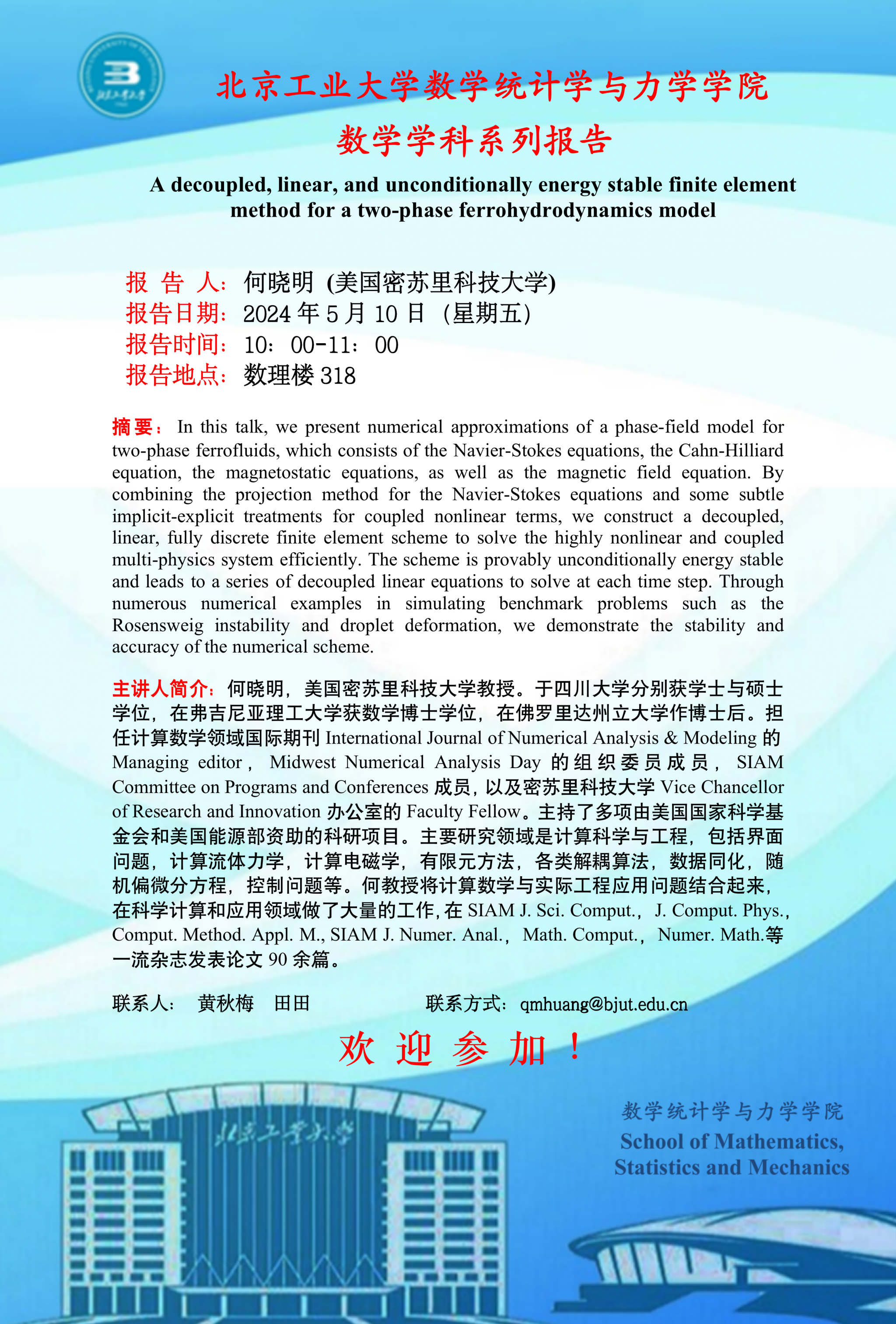 【数统力|学术报告】——A decoupled,linear,and uncouditionally energy stable finite element method for a two-phase ferrohydrodynamics model