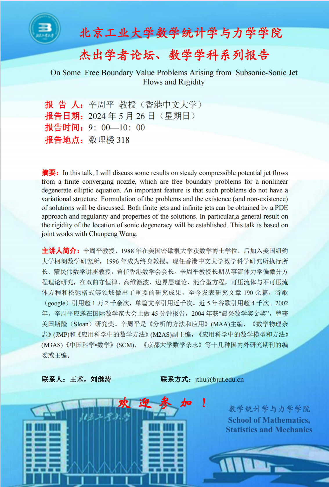【数统力|学术报告】——On Some Free Boundary Value Problems Arising from Subsonic-Sonic Jet Flows and Rigidity