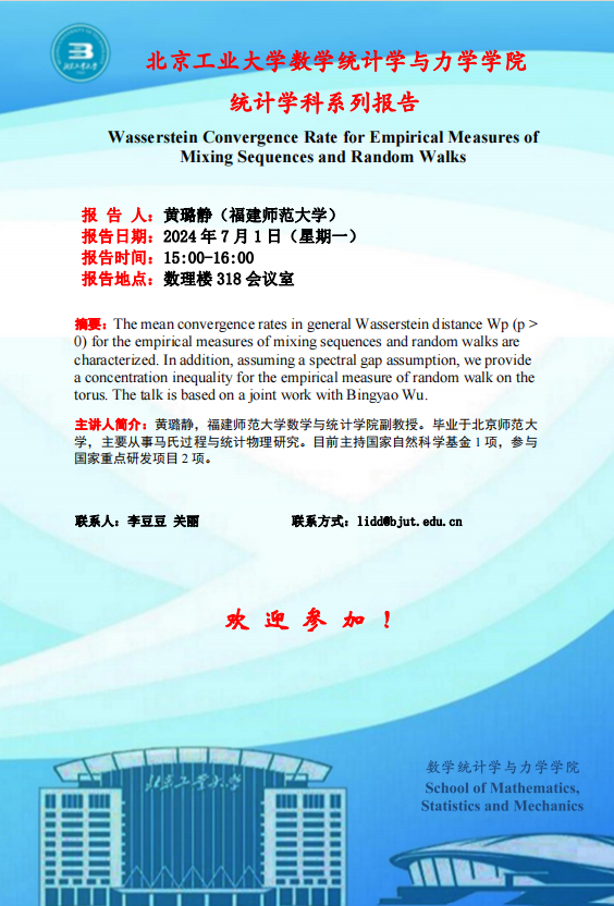【数统力|学术报告】——Wasserstein Covergence Rate for Empirical Measures of Mixing Sequences and Random Walks