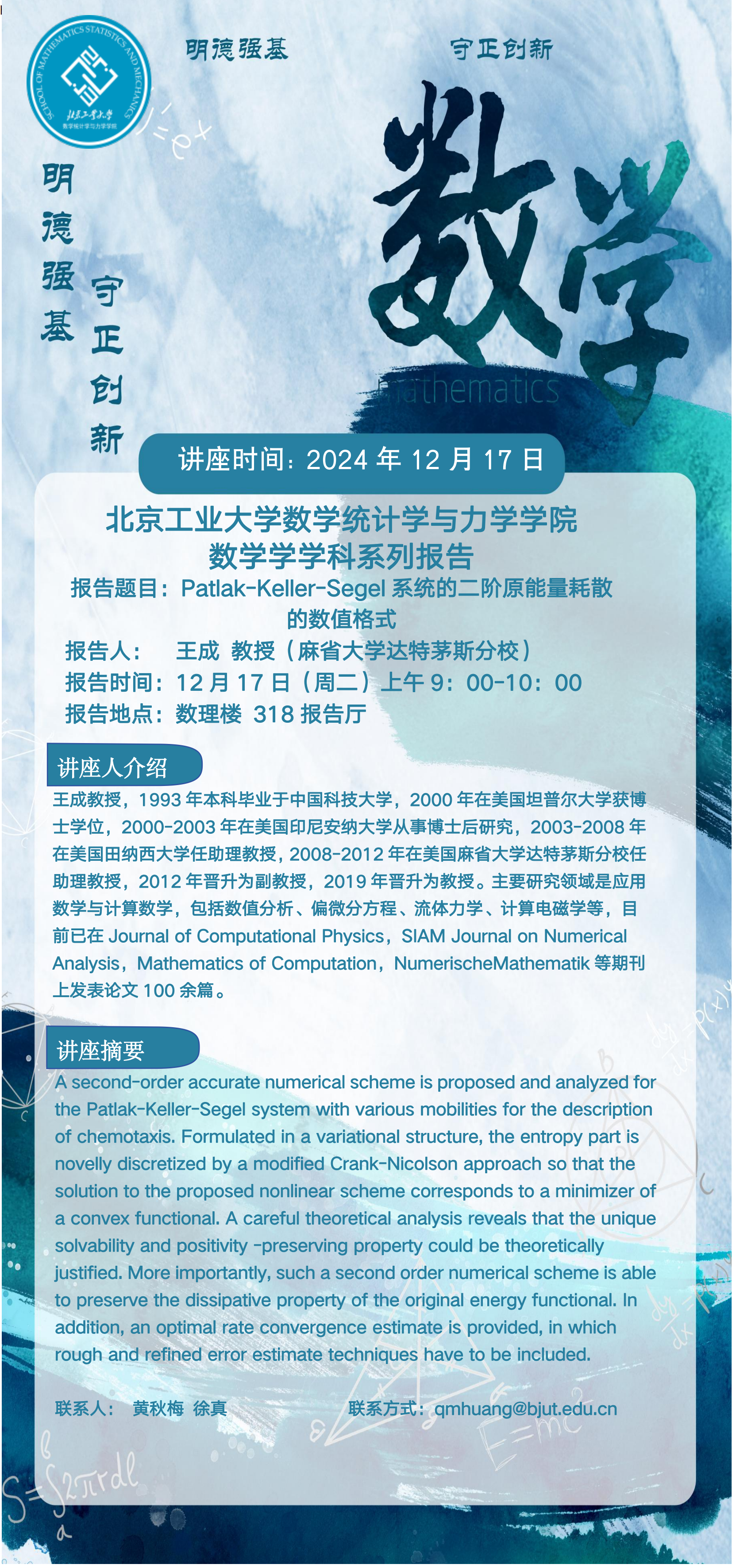 【数统力|学术报告】——Patlak-Keller-Segel系统的二阶原能量耗散的数值格式