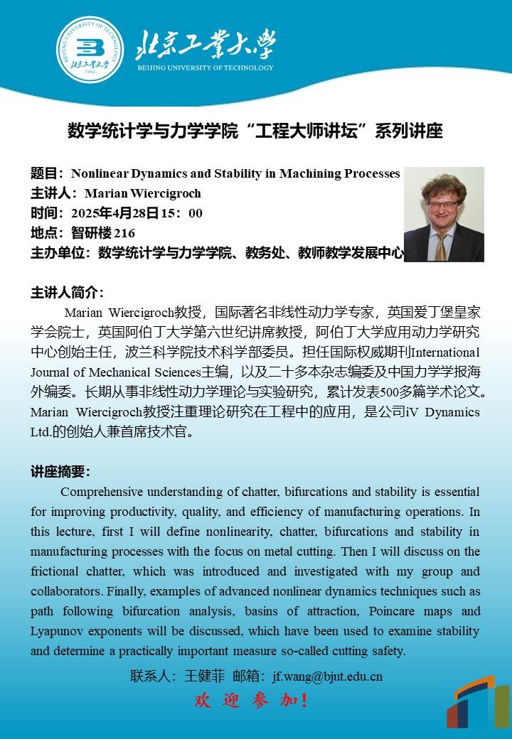 【数统力|学术报告】——Nonlinear Dynamics and Stability in Machining Processes