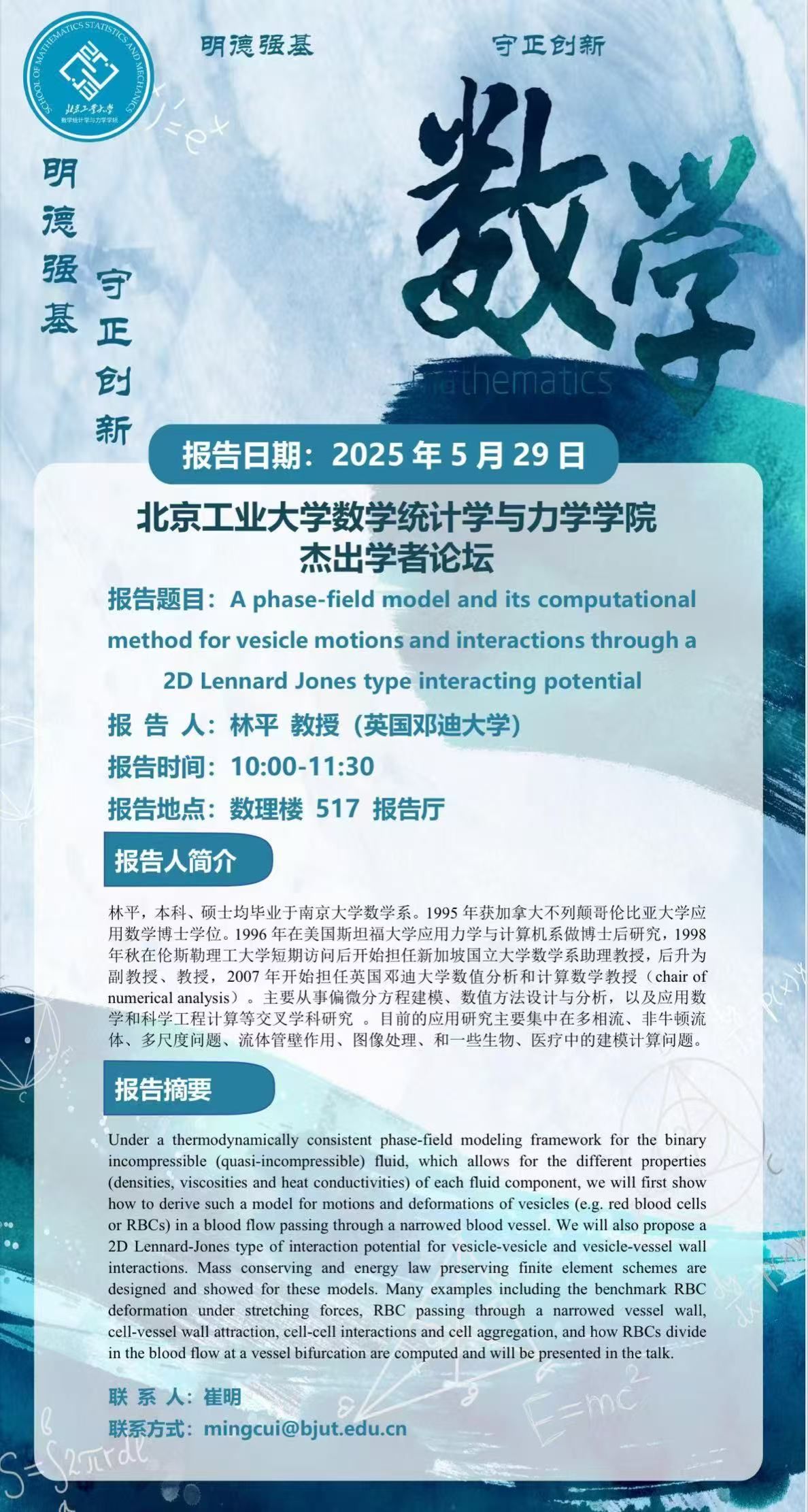 【数统力|学术报告】——A phase-field model and its computational method for vesicle motions and interactions through a 2D Lennard Jones type interacting potential