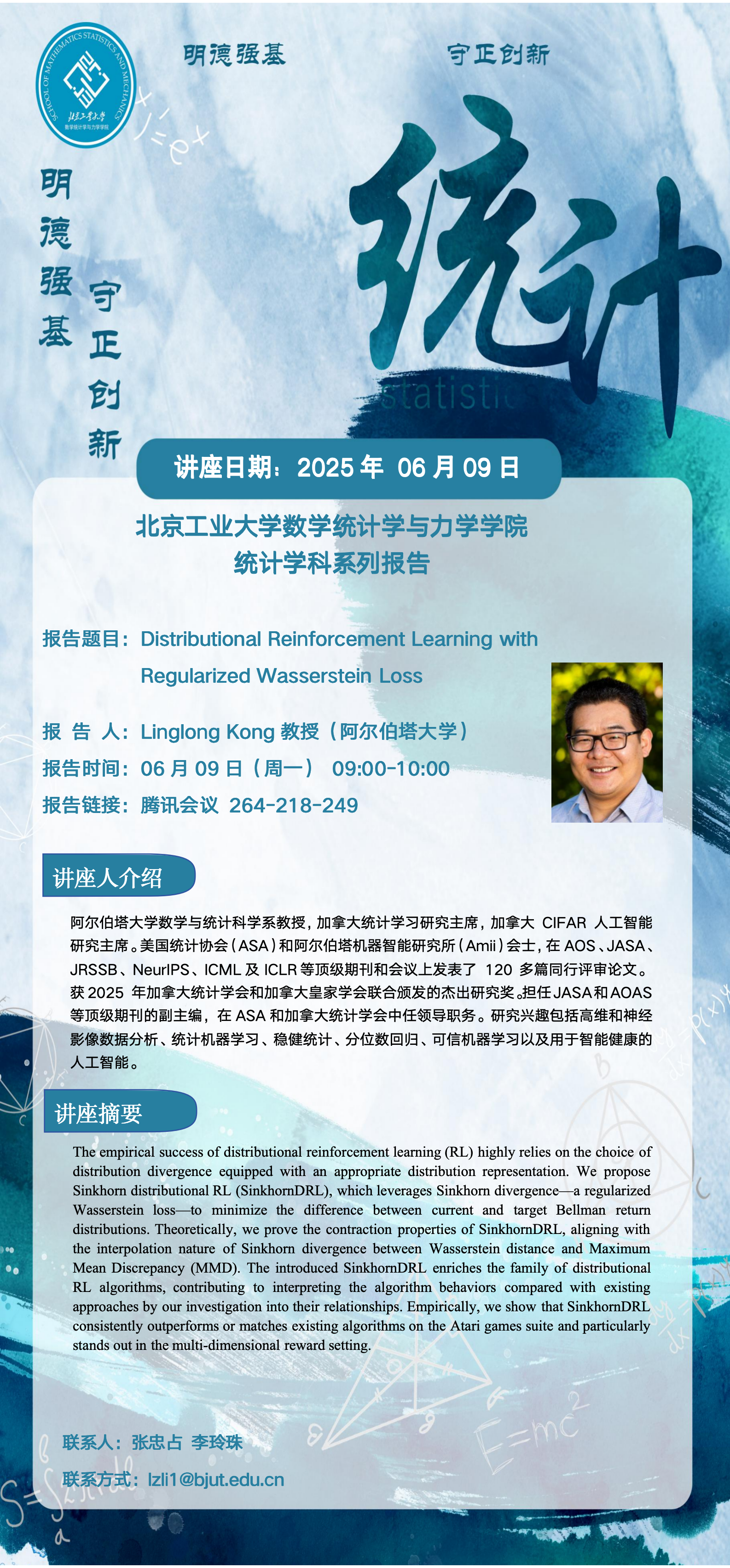 【数统力|学术报告】——Distributional Reinforcement Learning with Regularized Wasserstein Loss