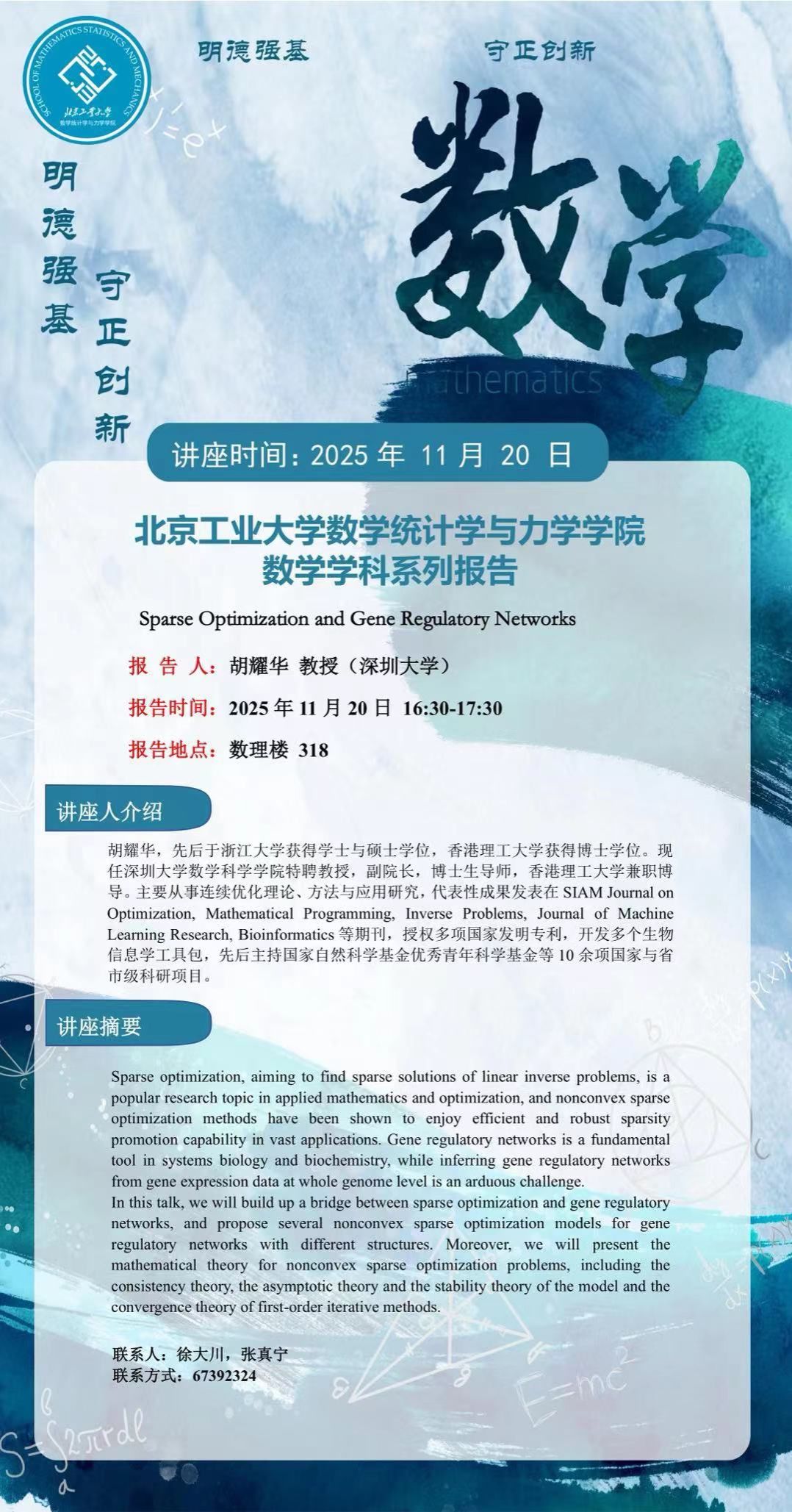 【数统力|学术报告】科技节系列活动“Sparse Optimization and Gene Regulatory Networks”