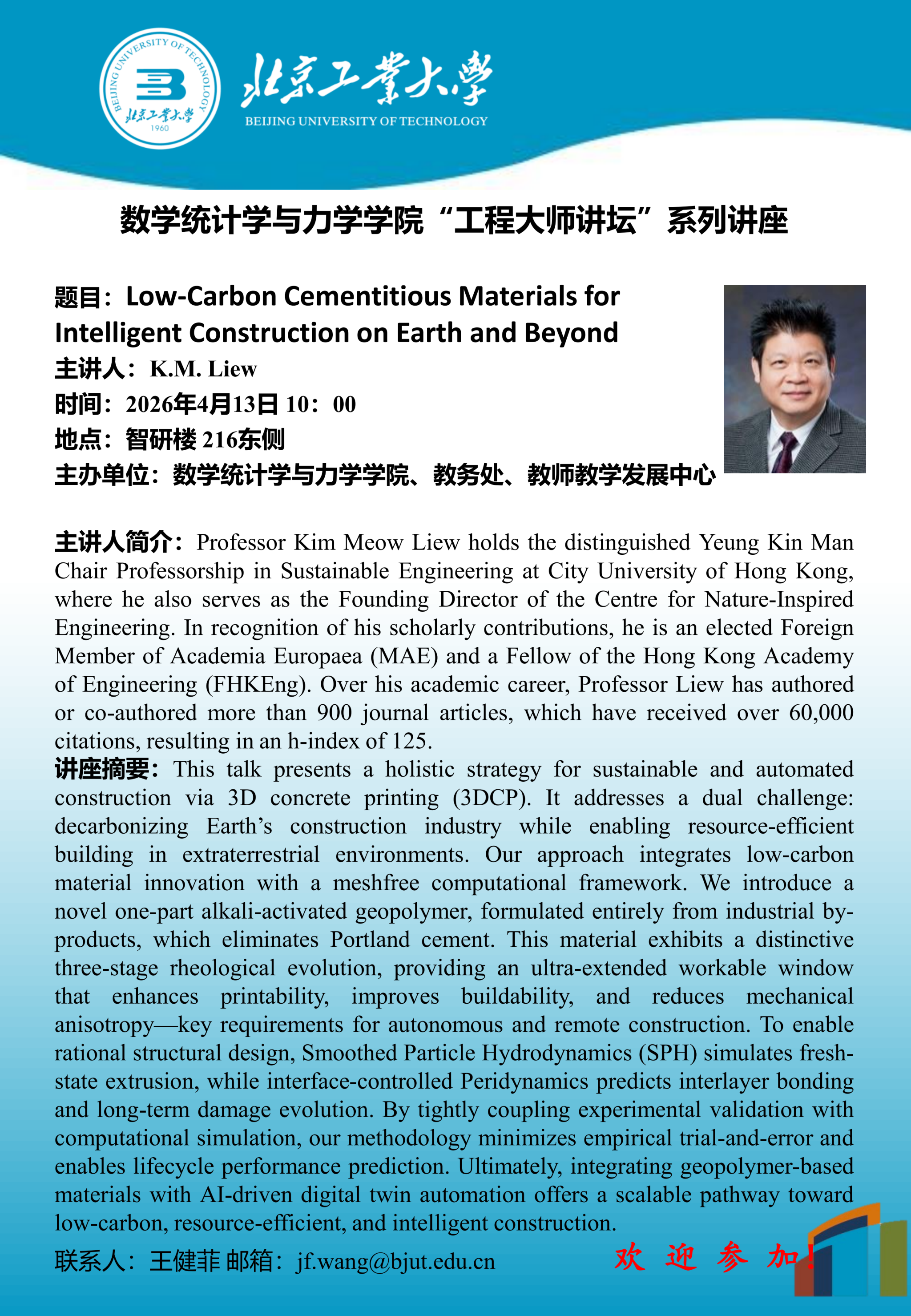 【数统力|学术报告】工程大师讲坛“Low-Carbon Cementitious Materials for Intelligent Construction on Earth and Beyond”